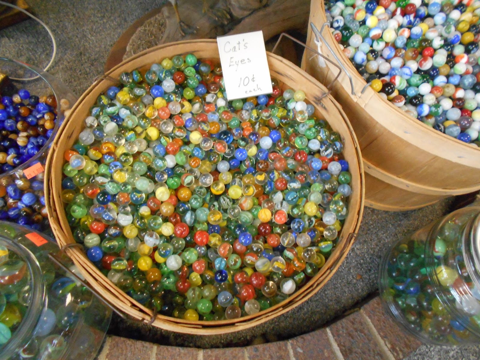 You walk in the store to visually see jars of marbles neatly arranged on shelves and large baskets of marbles saying take me home.